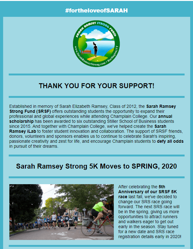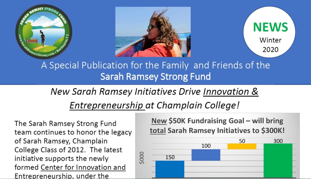 Our winter newsletter has been mailed out to everyone and you should be receiving it in your mail box any day now! If you want a sneak peak, download our PDF version to learn all about how the Sarah Ramsey Strong Fund continues to support the students of Champlain College.